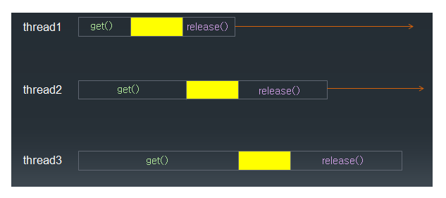 - 한 순간 오직 하나의 thread 만이 semaphore를 얻을 수 있고, 나머지 thread들은 대기(blocking) 상태