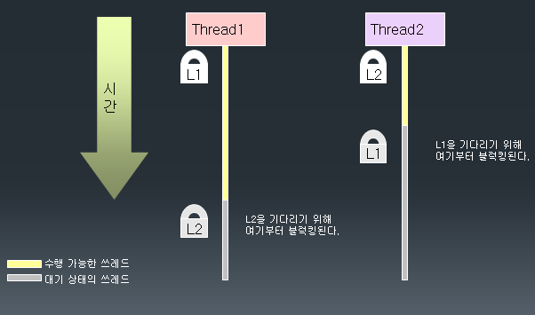 - 동기화를 잘못 구현하면 deadLock에 빠질 수 있음